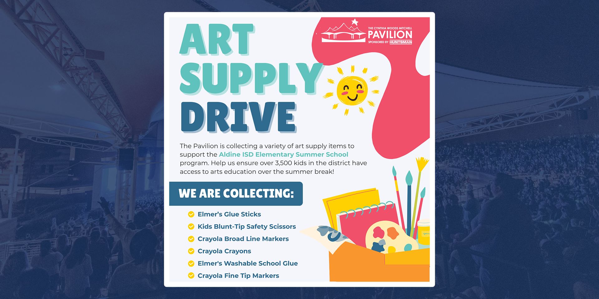 THE WOODLANDS, TEXAS – The Cynthia Woods Mitchell Pavilion is inviting the community to give back in a creative way through its upcoming Art Supply Drive, benefiting students in the Aldine ISD Elementary Summer School program.